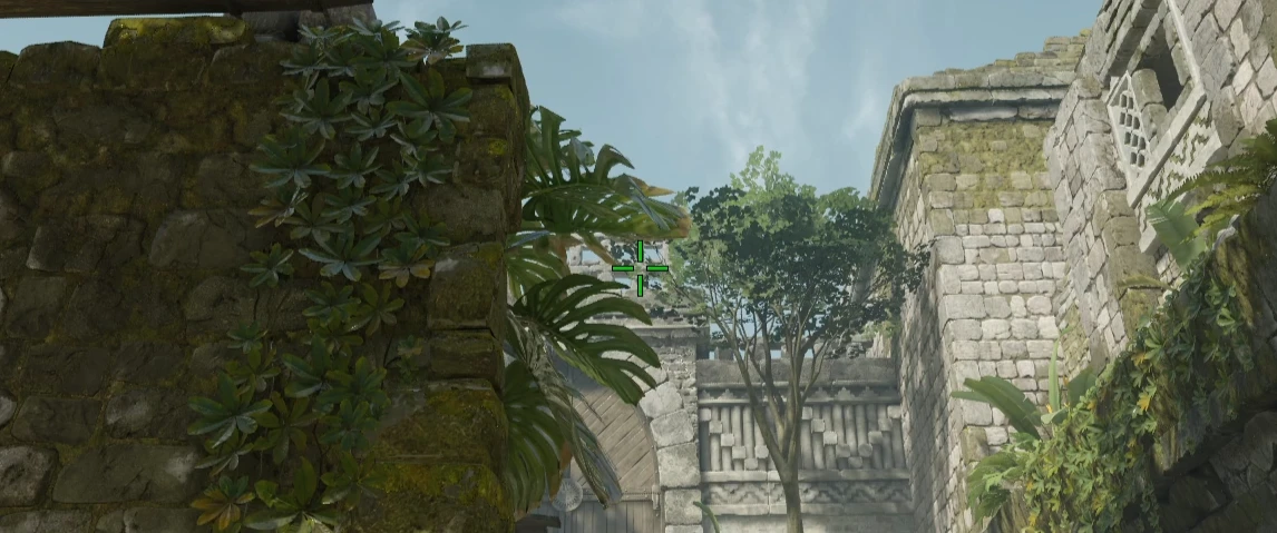 Align to the triple brick seam junction, offset left to the tree trunk notch